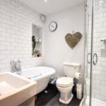 A four suite to include: roll top bath, shower cubicle, low level W.C, pedestal wash hand basin, tiled floor and walls.