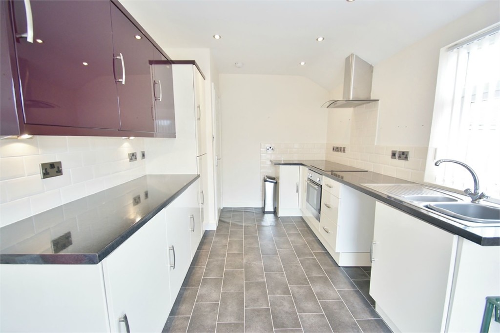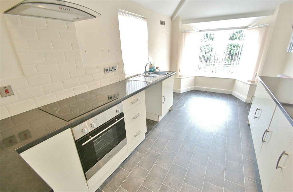 Kitchen/Dining Room 16' 10" into bay x 8' 7" (5.13m x 2.62m) With a range of cream and aubergine gloss fronted eye and base level units surmounted by contrasting roll-edge worksurfaces. Inset stainless steel 1.5 bol sink and drainer with mixer tap over. Tiling to splashback areas. Built-in stainless steel single electric oven, four ring ceramic hob and chimney extractor hob. Space and plumbing for a washing machine and fridge freezer. Vinyl floor. Recessed spotlights. TV aerial point. Double panel radiator. uPVC double glazed bay window to the front aspect. uPVC double glazed window to the side aspect.