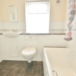En-Suite Wet Room With white low level toilet and pedestal wash hand basin. Combi shower. Tiling to splashback areas. Extractor fan. Tiled floor. Heated towel rail radiator. Recessed ceiling spotlights.