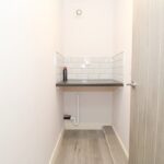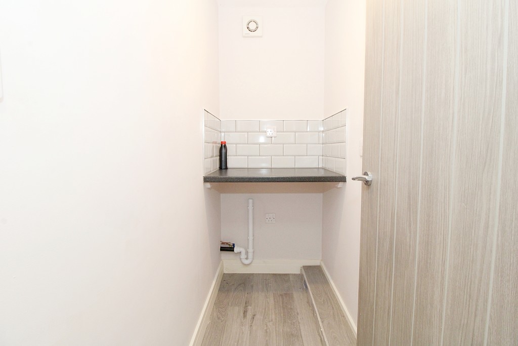 UTILITY ROOM Space and plumbing for a washing machine with roll-edge worksurface over and tiled splashback. Wall mounted extractor fan. Wood effect flooring.