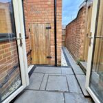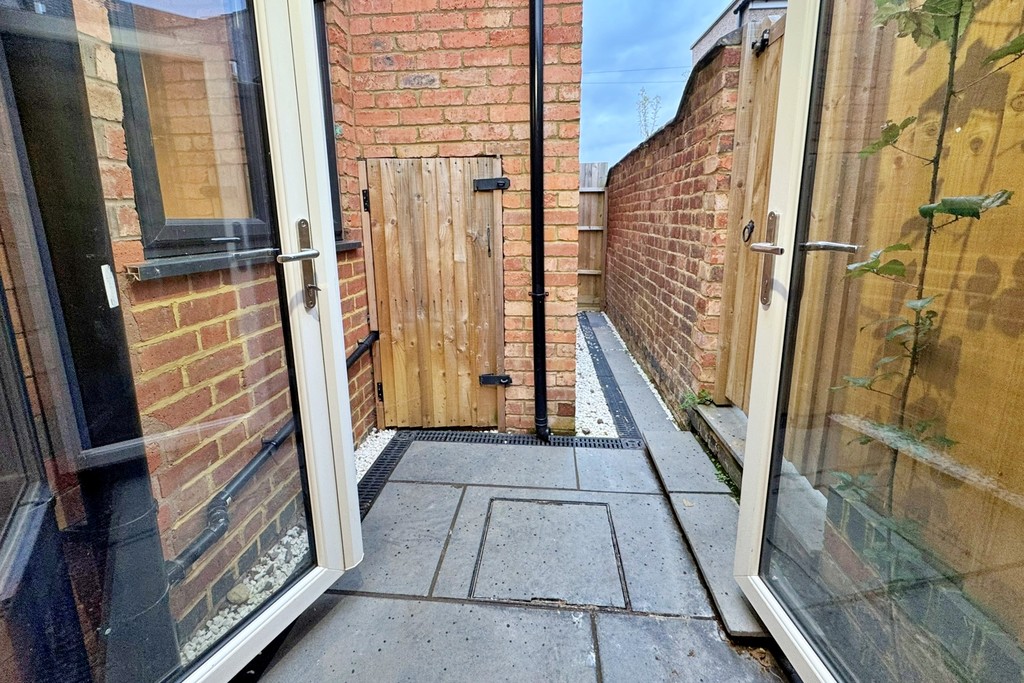 OUTSIDE Parking space to the front. Storm porch with courtesy light. Small yard area with an under stairs storage cupboard and gate leading to the side access which is further secured by a lockable metal gate.