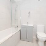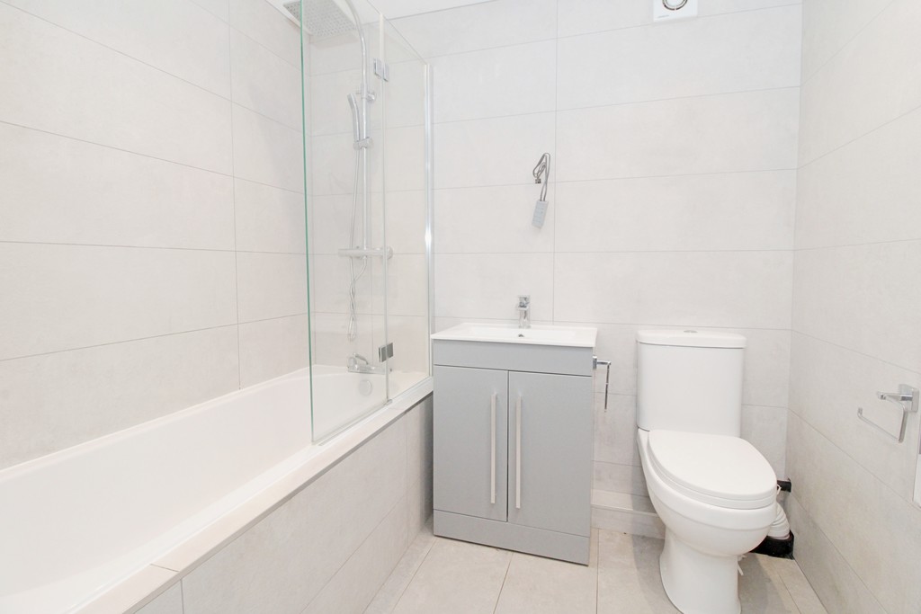 BATHROOM 7' 0" x 6' 1" (2.13m x 1.85m) White suite comprising: low level toilet, wash hand basin with vanity unit under and bath with tiled side and thermostatic shower over with rain effect showerhead. Fully tiled walls and floor. Recessed ceiling spotlights. Wall mounted extractor fan. Chrome heated towel rail radiator.