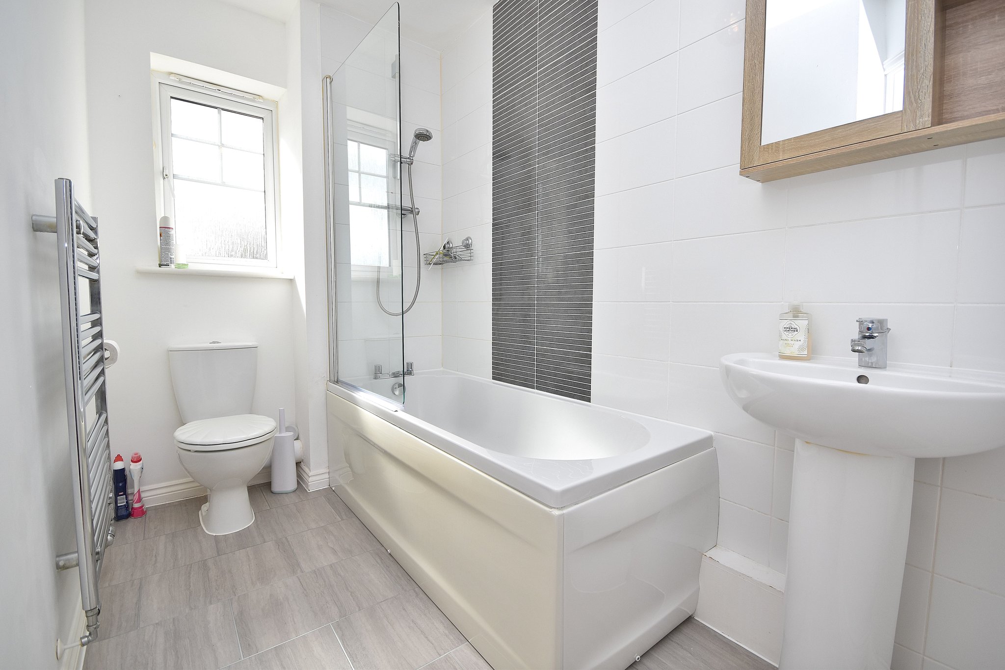 Fitted three piece suite comprising of a low flush wc, pedestal wash basin and panelled bath with shower and screen. Upvc double glazed window to the front aspect. Radiator.
