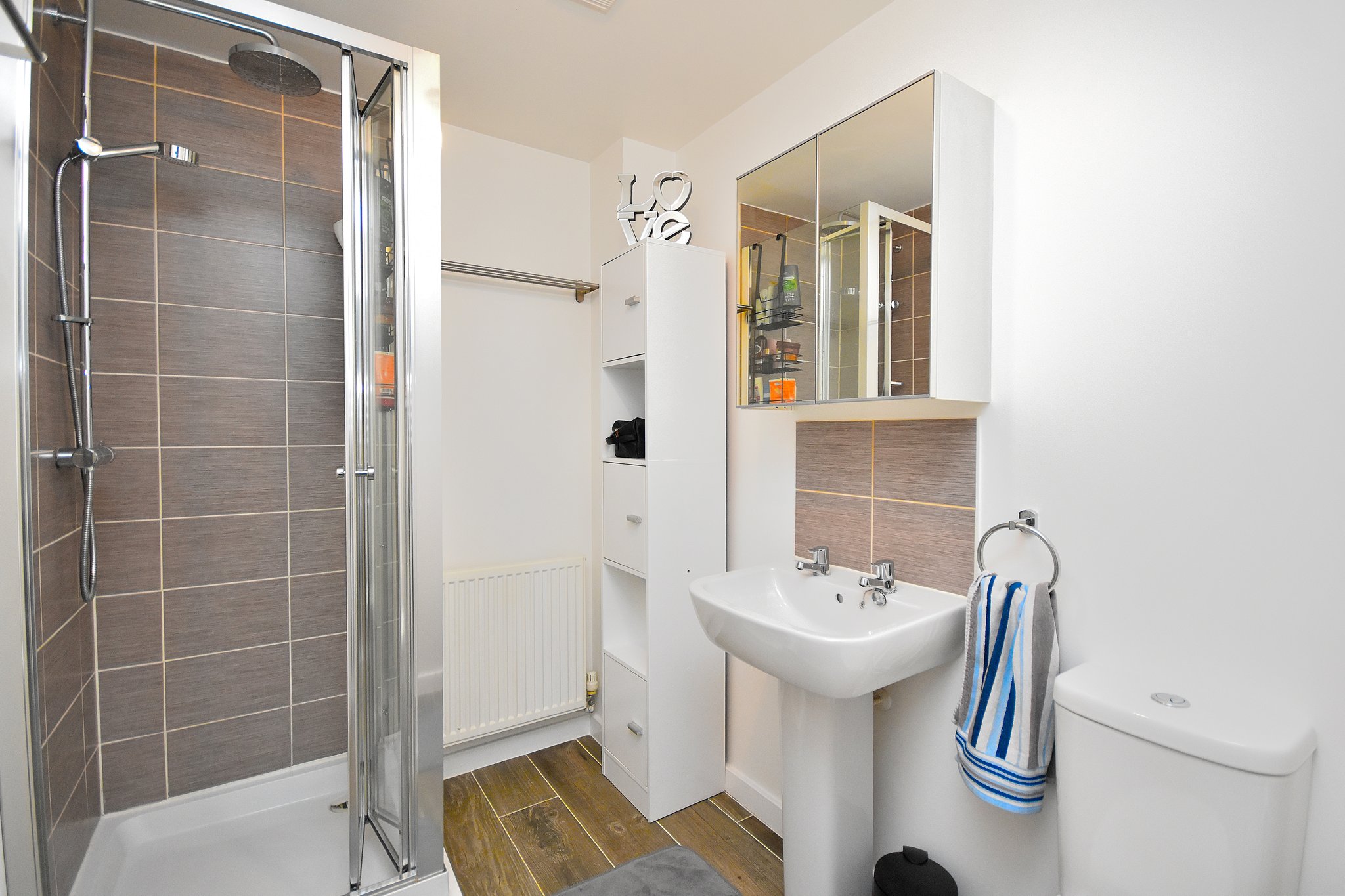Comprising of; Laminate flooring. Shower cubicle with shower over. Hand wash basin. Heated towel rail. W/C.