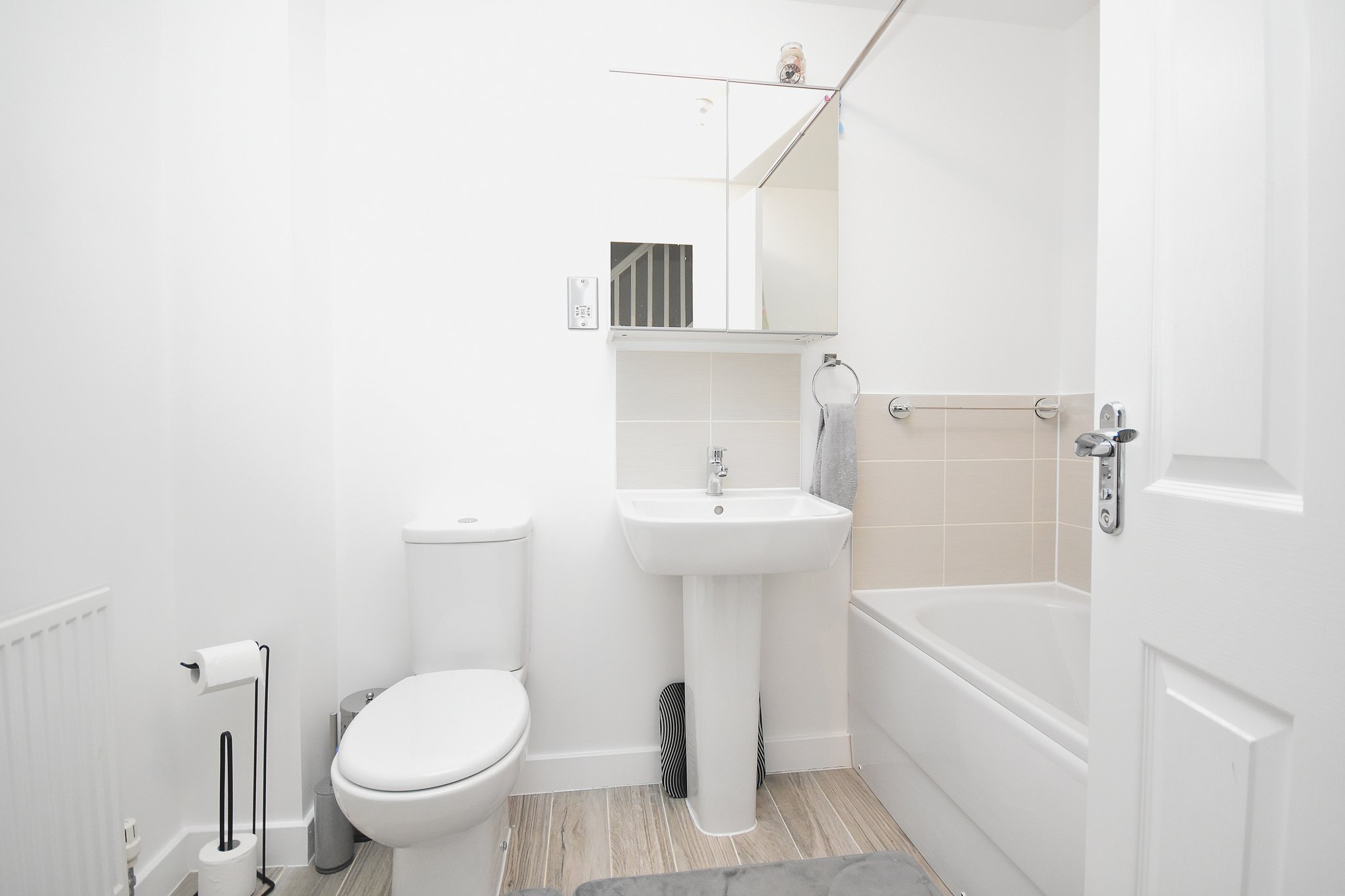 Comprising of; Laminate flooring. Bath with shower over. Hand wash basin with pedestal. W.C.